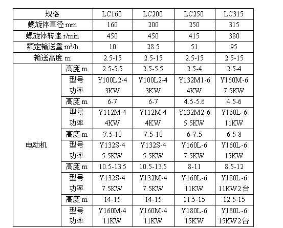 六、LC型垂直螺旋輸送機規(guī)格及技術參數(shù):